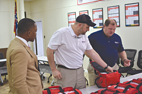 Eric Sprayberry, center, and Dave Eldridge, right, show Assistant Superintendent Charles Johnson, left, the medical supplies inside the emergency kit bags MedStat donated to the Greenwood Leflore Consolidated School District.