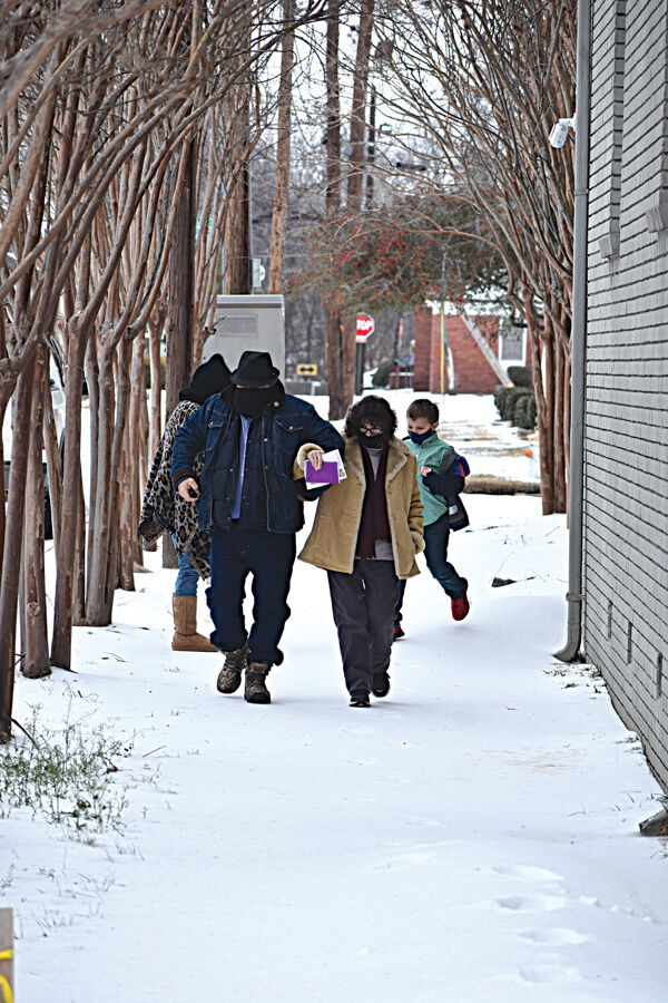 Buck Hill, left, escorts his mother, Donna Hill, down an ice-covered sidewalk outside Immaculate Heart of Mary Catholic Church following Ash Wednesday services at the church.