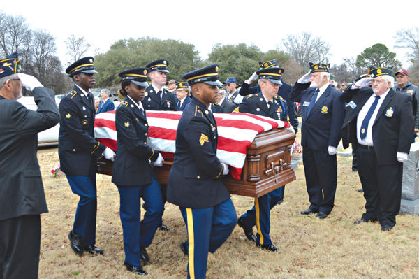 Members of the Mississippi Army National Guard serving as pallbearers carry the casket of Cpl. Joe Thomas Avant to his final resting place at Odd Fellows Cemetery.