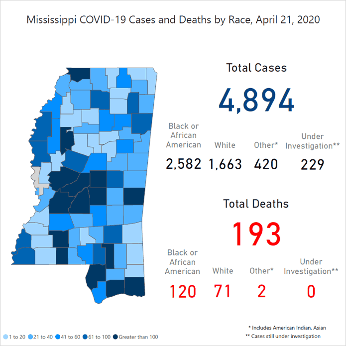 Mississippi COVID-19 cases and deaths as of April 21, 2020