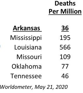 Yet Arkansas is doing much better than its shutdown neighbors with far fewer COVID-19 deaths per million residents.