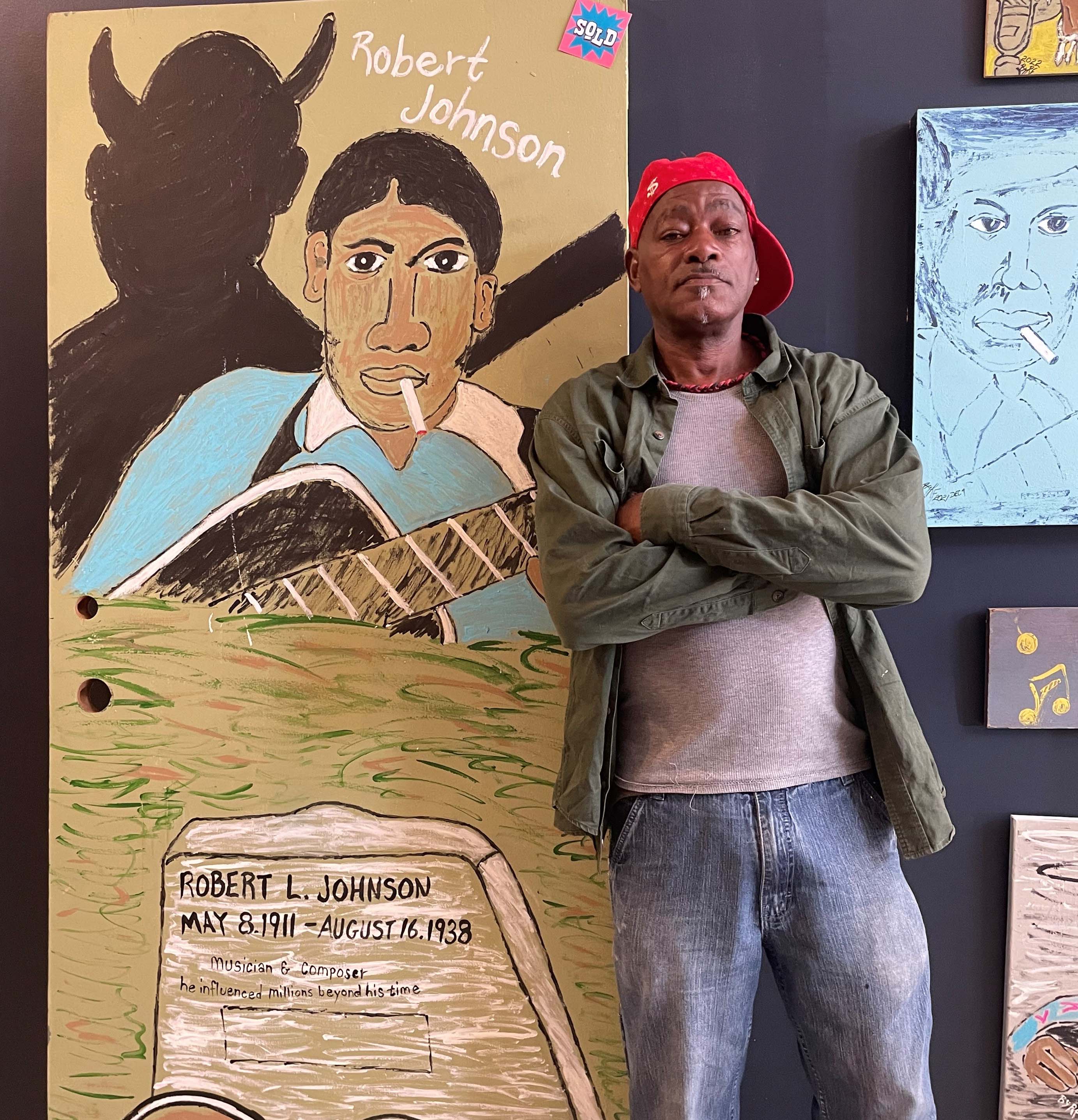 Many of his pieces, including those on display at Cru Fine Wine, depict musical icons such as Billie Holiday, Robert Johnson, Jonny Shines and B.B. King. They also feature scenery of the Mississippi Delta.