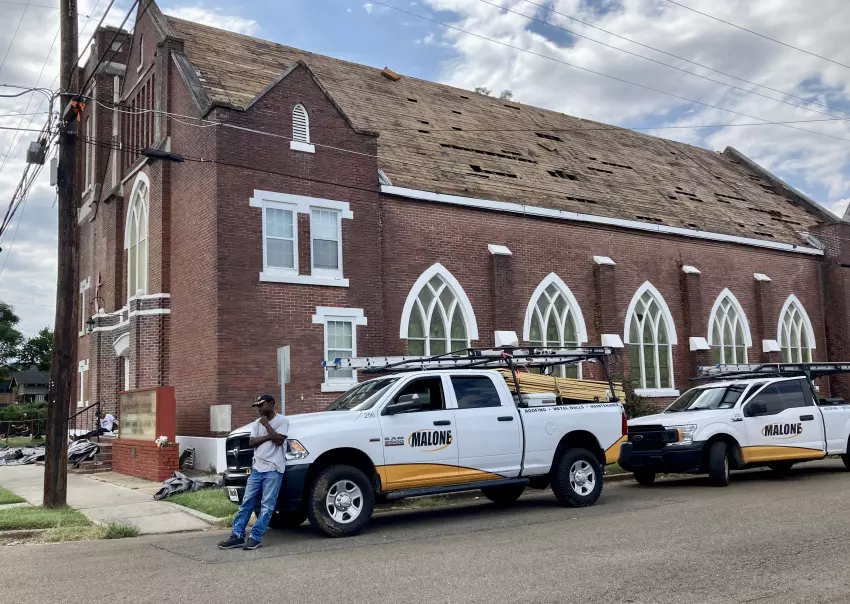 Wesley United Methodist Church, a Greenwood landmark at 800 Howard St., is getting a new 13,000-square-foot roof to replace the existing one, which had developed numerous leaks. Workers for Malone Roofing of Jackson began the installation Monday and expected to finish it by Tuesday. The current church building, which was placed on the National Register of Historic Places in 1985, dates back to 1922, when it replaced a wood-frame building that was destroyed by fire in 1920. The church itself was organized in 1870, and during the civil rights movement, Wesley was an organizing point for voter-registration marches. Also, the Greenwood office of the NAACP was housed there. “We’ve been fighting this roof for a long time,” said Dan Splaingard, a member of the church’s board of trustees who stopped by the site Monday. The replacement, he said, “is something we have been waiting to do and finally have the funds to do it.” (By Susan Montgomery)