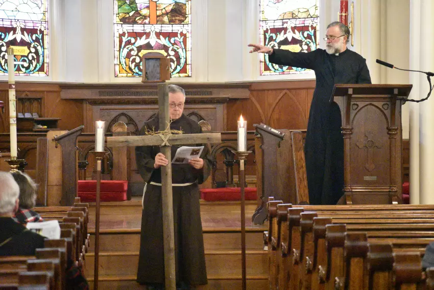 The Rev. Don Chancellor, the rector at the Episcopal Church of the Nativity, indicates the first station of the cross as Franciscan Friar Hilary Brzezinski holds the cross at the “Stations of the Cross” service held Friday in the church. The observance was originally to take place outdoors on a walking pilgrimage downtown but was moved indoors due to the rainy weather. (By Katherine Parker)