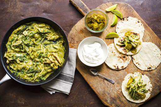 A portion of the liquid is pureed in a blender with tomatillos to make the salsa, while the turkey is reheated in the remaining liquid. We add the puree to the pan to meld the flavors for an easy, spicy-tangy filling for corn tortillas, served with sour cream and pickled sliced jalapeños on the side.