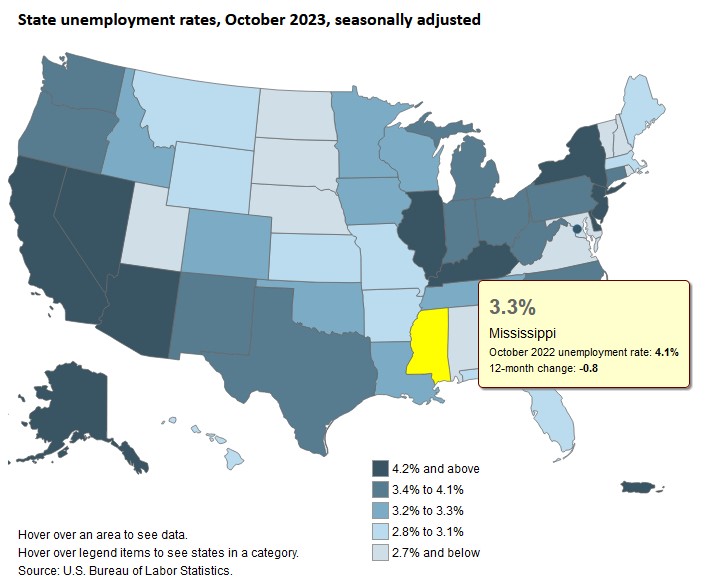 The current unemployment rate for Mississippi (as of October 2023) stands at 3.3 percent.