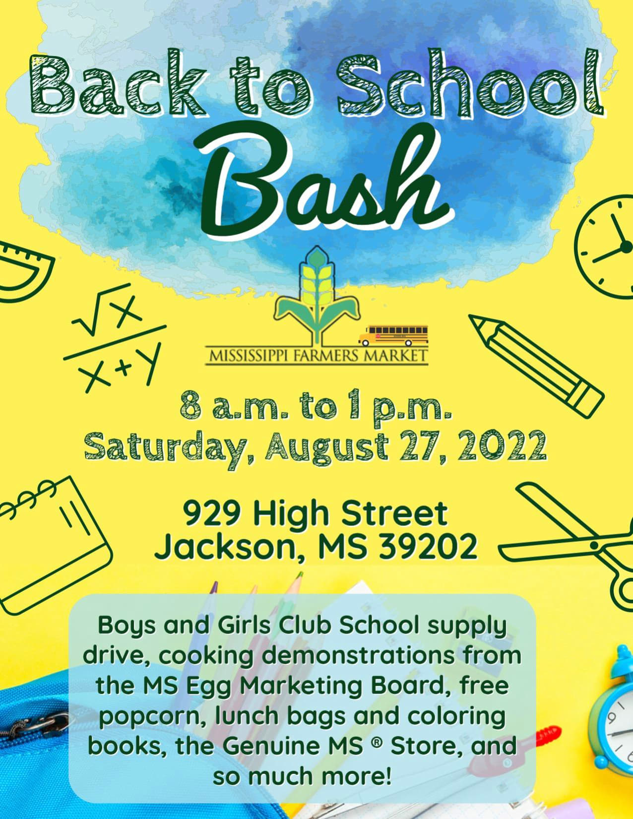 The Mississippi Farmers Market is hosting a Back-to-School Bash on Saturday, August 27, from 8:00 a.m. until 1:00 p.m., which will include a school supply drive benefitting the Boys and Girls Club of Central Mississippi. The Mississippi Egg Marketing Board will offer breakfast taco cooking demonstrations by Natasha Haynes with the Mississippi State University Extension at 9:00 a.m., 10:00 a.m. and 11:00 a.m.