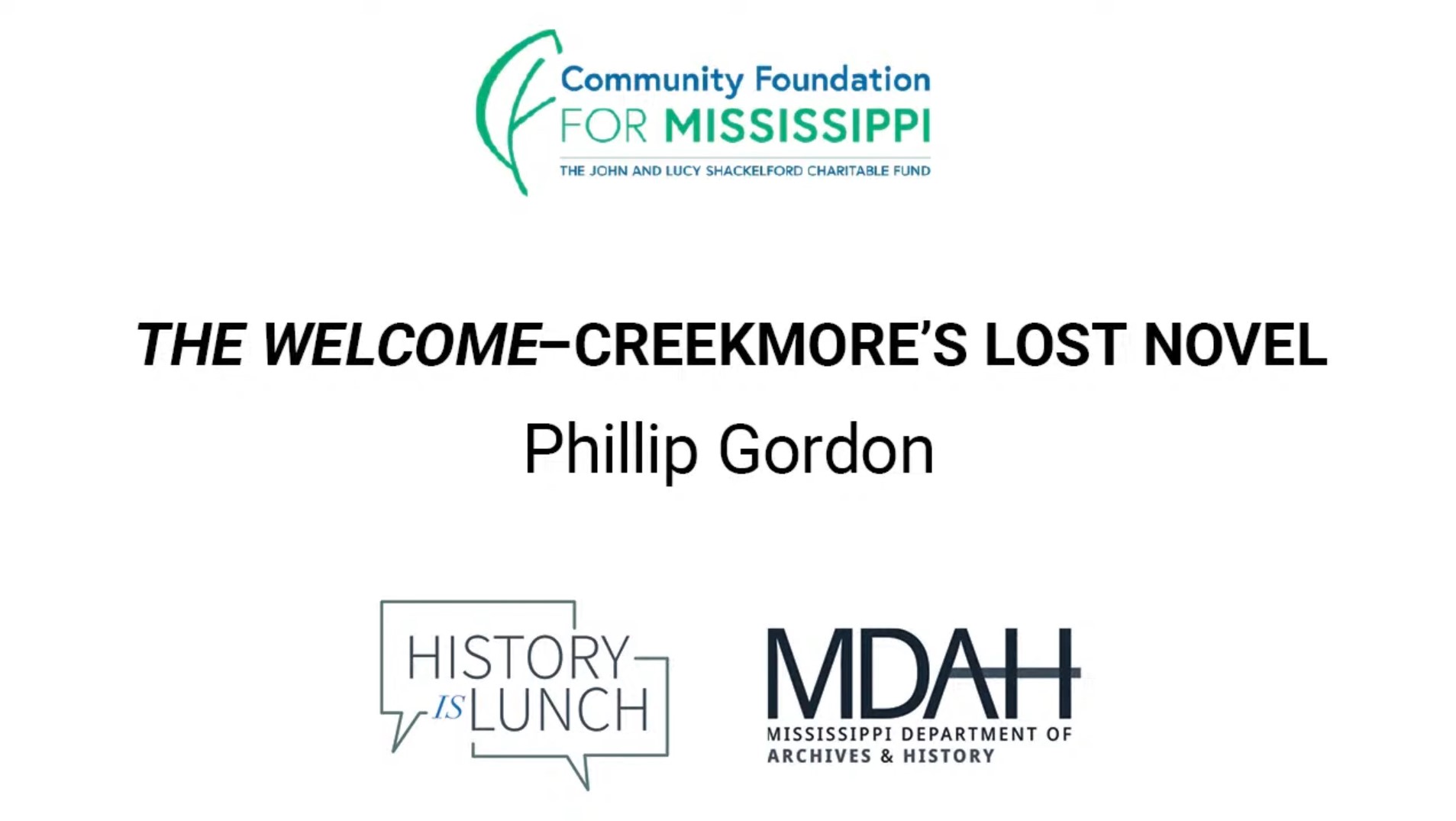 History Is Lunch is sponsored by the John and Lucy Shackelford Charitable Fund of the Community Foundation for Mississippi. The weekly lecture series of the Mississippi Department of Archives and History explores different aspects of the state's past. The hour-long programs are held in the Craig H. Neilsen Auditorium of the Museum of Mississippi History and Mississippi Civil Rights Museum building at 222 North Street in Jackson and livestreamed on YouTube and Facebook.
