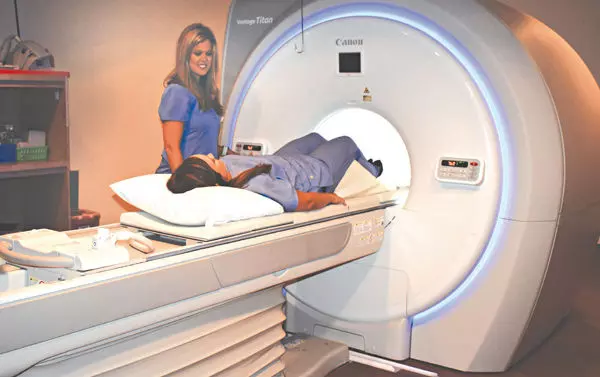 Claire Smith, MR safety officer and supervisor at Greenwood Leflore Hospital, and Brittany Ricks, MRI technician, demonstrate the wider capacity of the hospital’s new magnetic resonance scanner to create a better experience for patients who can otherwise feel anxious and claustrophobic while inside the machine. The shorter opening means less of a patient’s body is inside the machine at any time. The increased size of the “bore” also allows the hospital to scan patients up to 550 pounds.