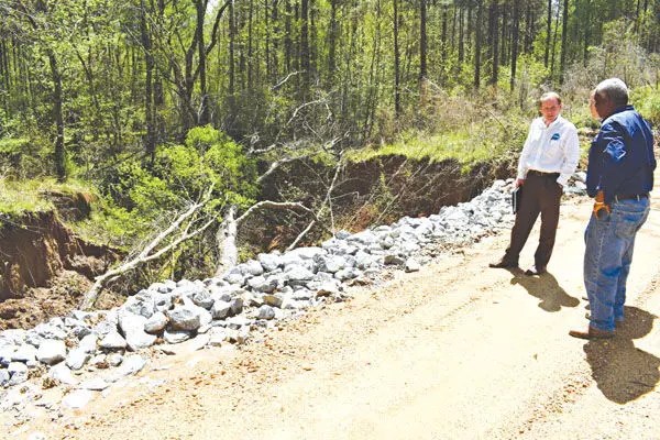 Carroll County Emergency Management Agency Director Ken Strachan, left, and Beat 4 Supervisor Claude Fluker show FEMA representative Mike Benner, partly obscured, a section of County Road 53 that had been wiped away when a stand of large trees was washed into a hole during last month’s heavy rains and flooding.