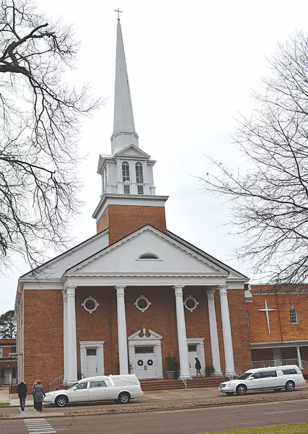 Gavin MaliskaTwo hearses sit outside North Greenwood Baptist Church Thursday morning as mourners gather for the funeral of Jim and Brooks Harrell. The Harrells and their friend Marlee Jones were shot dead last Friday, allegedly by Jones’s husband, Michael Barnhill, during a birthday party at their Carroll County home.