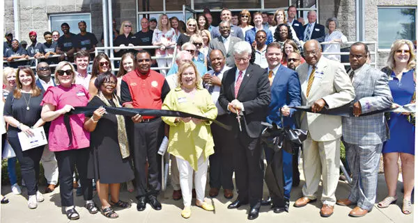 Dozens of people gather to welcome Lynx Grills to its new home along U.S. 82 West on Friday morning. Holding the ribbon so Gov. Phil Bryant could do the honors at the plant in Greenwood are, from left, Greenwood City Councilwoman Lisa Cookston, Greenwood-Leflore County Chamber of Commerce Ambassador Gloria Williams, Councilman Charles E. McCoy Sr., state Sen. Lydia Chassaniol, the governor, Viking Range President Kevin Brown, state Sen. David Jordan, Leflore County District 4 Supervisor Wayne Self and Viking Range Chief Financial Officer Jane Moss.