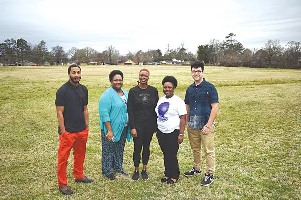 Members of Here We Stand Inc. stand on the site of a community garden that will soon be planted on land across Linden Avenue from Greenwood Middle School. From left are Kenderick Cox, Tamnral Johnson-Rice, Shelia Boston, TyKaren Carr, and Nick Onyshko.