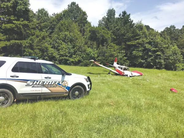 A Beechcraft B23 Musketeer sits in a field July 4 after crashing about 50 yards from the grass airstrip owned by Walter Mitchell near Vaiden. Mitchell suffered the worst injuries among the four people aboard the plane with a broken right arm, fractured hand and fractured sinuses.