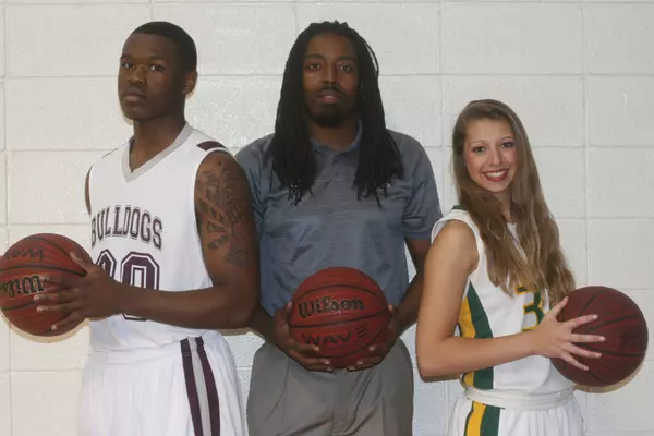 Greenwood High School senior center Lewis Freeman, left, and Pillow Academy senior Merritt Belk, right, are the Commonwealth Players of the Year for the 2013-2014 basketball season. Greenwood’s Fred Ford, middle, has been named the paper’s Coach of the Year.