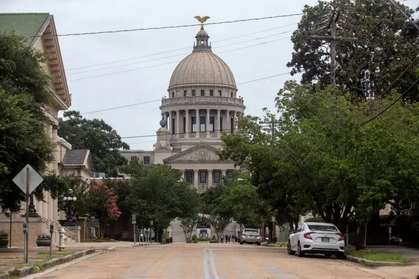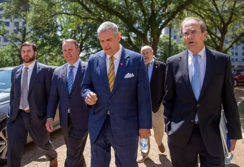 Mississippi House speaker Philip Gunn, center, and Lt. Gov. Delbert Hosemann, right, talk after Gov. Tate Reeves press conference at the State of Mississippi Woolfolk Building in Jackson, Miss., Thursday, May 7, 2020. Credit: Eric J. Shelton/Mississippi Today