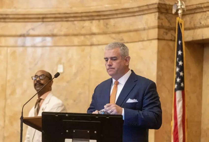 Lt. Gov. Delbert Hosemann speaks with members of the media during a press conference inside of his office at the State Capitol in Jackson, Miss., Monday, March 14, 2022. One of the issues discussed during the press conference was the Post Partum Bill, Senate Bill 2033, which died last Wednesday. Credit: Eric Shelton/Mississippi Today