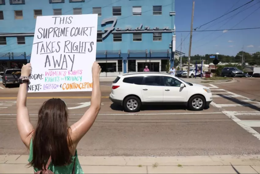A pro-choice activist holds a sign outside of the Jackson Women's Health Organization in Jackson, Miss., Friday, June 24, 2022. The Supreme Court overturned Roe vs. Wade, the 1973 case that established a person’s right to an abortion. Credit: Eric Shelton/Mississippi Today