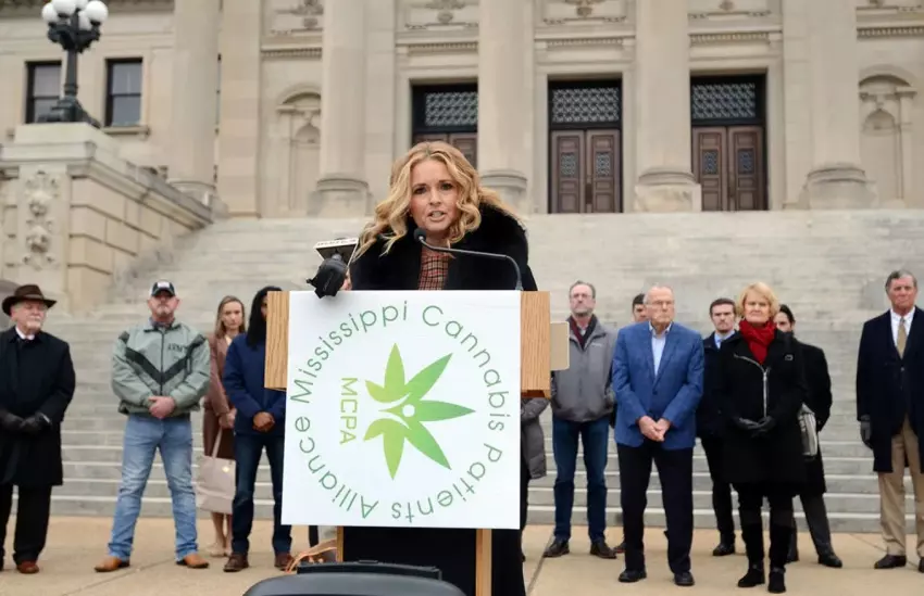 From the south steps of the Capitol, Mississippi Cannabis Patients Alliance founder Angie Calhoun with supporters, makes a plea to the Governor to change his position on medical marijuana on Tuesday, Jan. 4, 2022, in Jackson. Credit: Vickie D. King/Mississippi Today