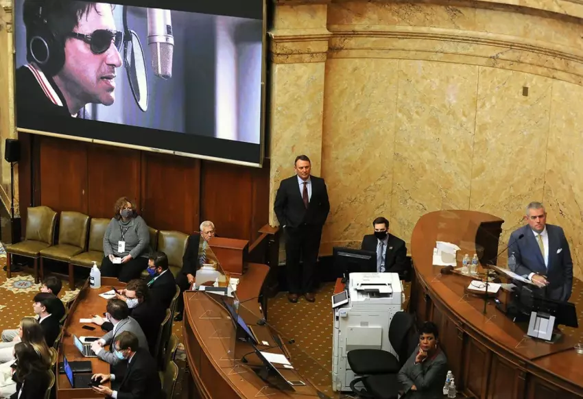 House Speaker Philip Gunn, far right, and others gathered in the House of Representative chambers, listen to singer/songwriter Steve Azar sing, "One Mississippi", during the first day of the legislative session, Tuesday, Jan. 4, 2022. Credit: Vickie D. King/Mississippi Today