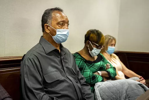 BRUNSWICK, Ga. (AP) — A judge denied mistrial requests Monday at the trial of three white men charged with murdering Ahmaud Arbery after defense attorneys claimed jurors were tainted by weeping from the gallery where the slain Black man's parents sat with the Rev. Jesse Jackson.