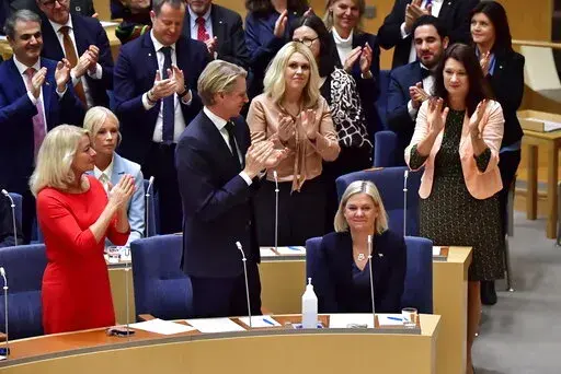 Denmark's Prime Minister Mette Frederiksen, takes part in a coronavirus press conference, with Minister of Health Magnus Heunicke, left, and director of the National Board of Health Soeren Brostroem, right, in Copenhagen, Denmark, Wednesday Jan. 26, 2022. (Mads Claus Rasmussen/Ritzau Scanpix via AP)