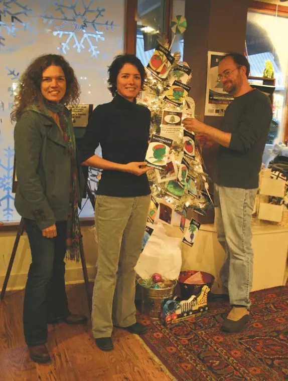 Book trees with seed packet ornaments have been placed in Turnrow Book Co. in Greenwood and Books in Grenada this year. Helping to coordinate this project are, from left, Robin Whitfield, Hart Henson and Jamie Kornegay. Each purchase will give one student their Christmas wish book.