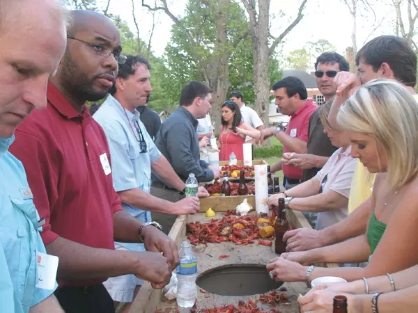 Last year’s crawfish party kicked off the inaugural year for Greenwood-Leflore Young Professionals. They have decided to bring the event back this year to continue to recruit members. Eating crawfish are, from left, Jeff Hardin, Kelvin Scott, McLeod Meek, Chase Sanders, Haley Farris, Eric Miller, Don Brock Jr., Sonya Lunsford, Hart Kittle and Heather Williams.