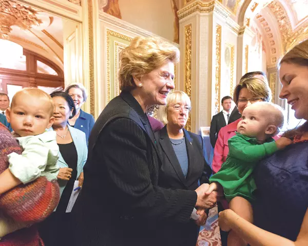 Sen. Debbie Stabenow, D-Mich., center, and Sen. Patty Murray, D-Wash., center right, and other Democratic lawmakers joined new mothers and their babies at the Capitol in Washington to criticize Republican efforts to kill the Affordable Care Act, popularly known as “Obamacare.”