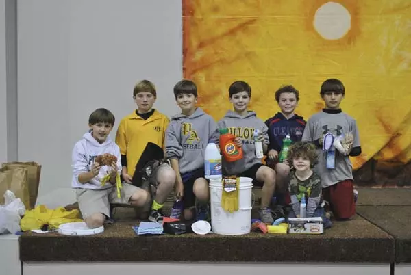Children at St. John’s United Methodist Church are soliciting donations through the month of January for flood buckets to be shipped to New York and New Jersey for Hurricane Sandy relief efforts. Pictured, from left, are Britt Reichle, Lawes McCool, Matthew Jefcoat, Michael Jefcoat, George Ray Mohamed, Carter Tackett and Jack Reichle.