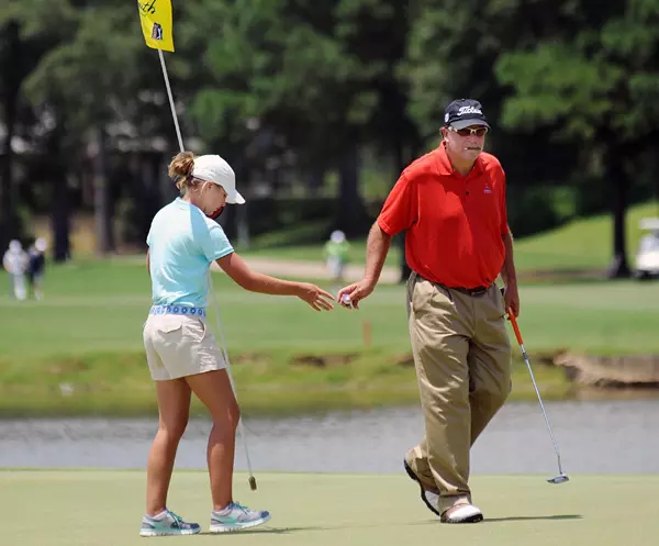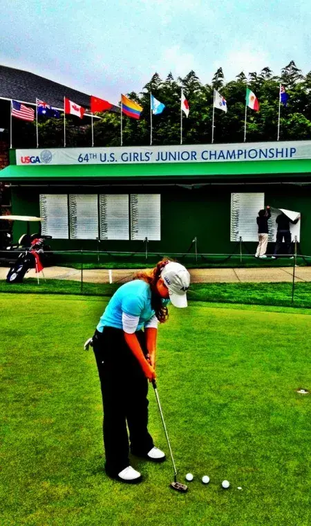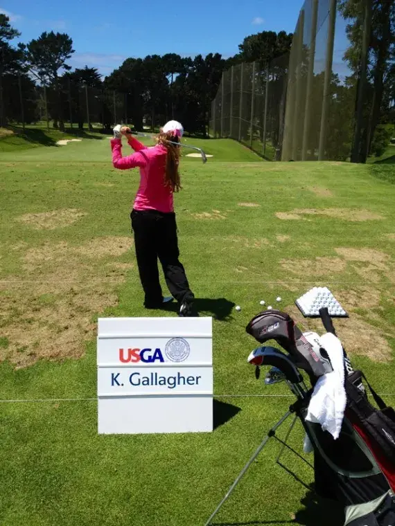Greenwood’s Kathleen Gallagher warms up on the range Tuesday prior to her second round of stroke play in the U.S. Girls’ Junior Championship. She shot 81 Tuesday and wound up tied for 28th out of 156 of the top junior players in the world. Gallagher, 15, was scheduled to begin her first match in the match-play round at about noon today.
