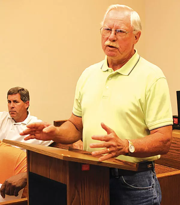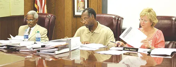 Greenwood School Board President Bill Clay, center, peers out over a stack of policy manuals, school district plans, emergency procedures and other district documents that were up for annual reapproval at Tuesday’s board meeting. Also pictured are school board members George Ellis, left, and Kathy Whicker, right.