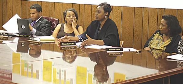 Shaquita Burke, center, the business director for the Greenwood Public School District, explains her budget projections for the upcoming school year during a specially called board meeting Tuesday. Also pictured, from left, are Carlos Palmer, board attorney; Margaret Dean, director of communications; and Brenda Smith, technology coordinator for the district.