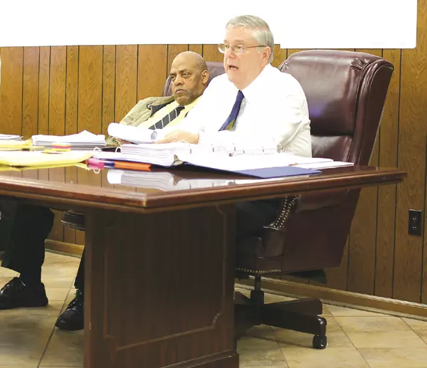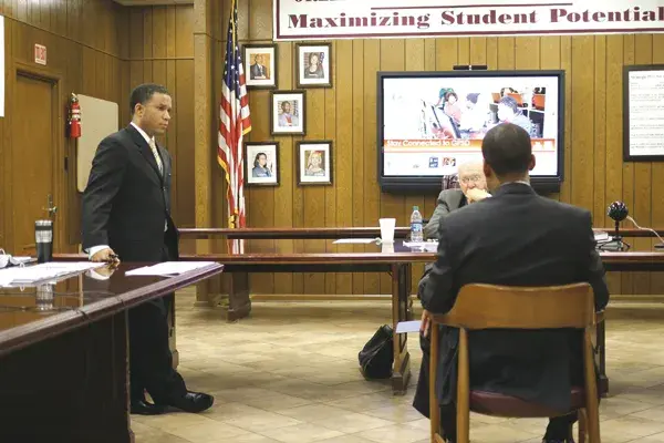 Greenwood Superintendent Montrell Greene, right, answers questions from School Board Attorney Carlos Palmer, left, during Tuesday’s hearing for Percy Powell, a principal at the high school whose contract was not renewed. Also pictured is Luke Schissel, center, a Greenwood attorney who is acting as hearing officer.