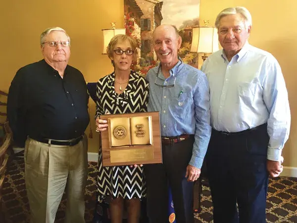 Connie Johnson, center, an active volunteer with the Greenwood Mentoring Group and a member of the Greenwood School Board, is awarded the Book of Golden Deeds by the Greenwood Exchange Club. Johnson is pictured with her husband, James, center, and Exchange Club program chairs Jan Verhage, left, and Jim Jackson, right.