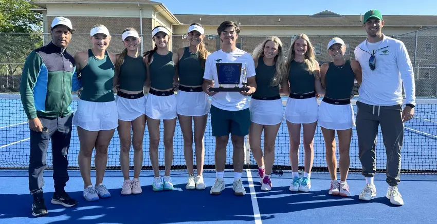 Pillow Academy’s tennis team finished in first place in the girls division of the District 1-5A Tournament on Tuesday. From left are assistant coach Suresh Chawla, Jane Kimmel Buford, Annie Powers, Millie Smith, JonHartley Slater, James Thomas Mattox, Madeline Carroll, Sarah Douglas Thach, Izzy Hodges and head coach Marko Lovrinovic. (By Mignon Hodges)