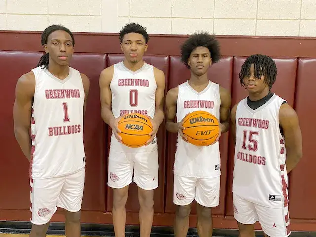 Greenwood High School’s boys basketball team placed four players on the Region 3-4A All-District squad that was announced at the conclusion of the district tournament Friday night. From left, are, Frederrick Ford, Jaiden Jenkins, Michael Steele and Jeremiah Kendrick. Jenkins was named the Defensive Player of the Year, and Kendrick was named the Offensive Player of the Year. The Bulldogs play at South Pontotoc Tuesday night in the first round of the North 4A Tournament. (By Calvin Stevens, Copyright 2025 Emmerich Newspapers, Inc.)