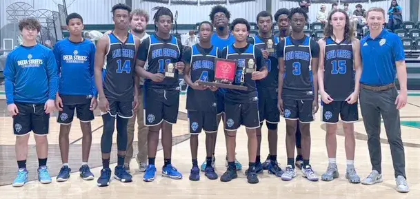 Delta Streets Academy brought home second-place hardware from the North 4A Tournament Saturday at Lee Academy. Members of the team are, from left, Parker Beach, Josh Wallace, Ahmaude Jones, coach Bo Giordano, Lance Link, Shaquan Applewhite, Chris Jones, Kamron Hurt, Ja’Den Purnell, Cleo Jones, Nehemiah Washington, Autry Oates and head coach Jonathan Holland. Link, Hurt and Purnell made the North 4A All-Tournament team. The Lions open play in the State 4A Tournament at Canton Academy Wednesday against Amite School Center.