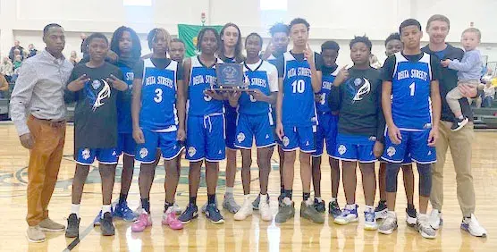 The Delta Streets Academy boys won the District 2-4A junior high tournament Saturday. The Lions finished the season an overall record of 11-9. Members of the team are, front from left, assistant coach Shaq Miller, Charles Davis, Eddie Payne, Duke Terry, Terrall Prayer, Jarvis Davis, Autry Oates, Shaquan Applewhite, Hutch Dawson, Braylon Carter, Dashun Hogan, Kerrick Nevels, Tim Fisher, Josh Wallace, head coach Jonathan Holland and his son, Clay Holland.