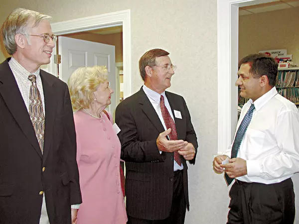 In this May 9, 2002, file photo, Dr. Arnold Smith, left, and his then-medical partner, Dr. Ed Rafique, right, visit with Belva Pleasants and Ed Hill during a Business After Hours event at their clinic. Shortly after that, the two cancer doctors split.
