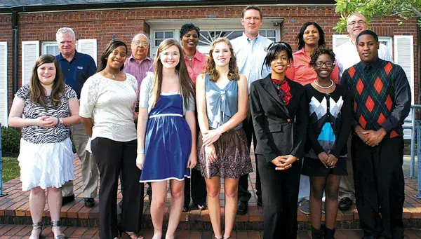 Students and sponsors of the Greenwood-Leflore County Chamber of Commerce’s annual Student Achievement Awards stand on the chamber’s front steps Thursday following a ceremony. Each student got a $500 scholarship. Front row, from left, are students Allison Franklin, North New Summit School; Mia Williams, Leflore County High School; Katie Gregory, Pillow Academy; Kristen Stephens, Pillow Academy; Johnnay Holt, Greenwood High; Salome Weathers, Greenwood High; and Joerick Grice, Amanda Elzy High. In the back are sponsors Dale Persons, Viking Range Corp.; V.K. Chawla, Chawla Management; Margaret Buchanan, Greenwood Leflore Hospital; Lance Gregory, Cannon Motor Co.; and Yolanda Williams and Tom Jennings, Double Quick. Not pictured is Jasmine Carter, Greenwood High, Dr. V.K. Chawla. Story, Back Page