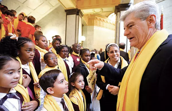 APGov. Phil Bryant, right, greets students from Greenwood's St. Francis Elementary School and a teacher, Sister Elena Gonzales, second from right, following a rally by school choice proponents Tuesday at the Capitol in Jackson as prospects remain unclear for House and Senate bills that would expand programs to spend public money to pay for students to attend private schools.