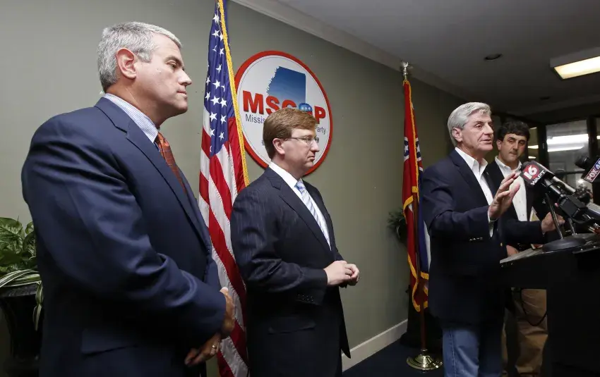 Gov. Phil Bryant argues against Initiative 42, a proposed constitutional amendment that would require the state to provide “an adequate and efficient system of public schools,” during a news conference in Jackson on Tuesday at the state's GOP headquarters. Also speaking against the proposed amendment were Lt. Gov. Tate Reeves, second from, left, and House Speaker Philip Gunn, left.