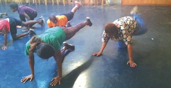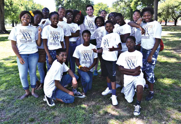 First-year Amanda Elzy Junior High teacher Kyle Lemere, center, stands with his eighth-grade students during their end-of-the-year field trip at Whittington Park. Pictured are, back row, from left, Ataysia Brown, Tkayla Brown, Demetrius Robinson, Keyara McCline, Marquavious Williams, Khydajah Harris, Kenya Roper, Lemere, Jakeeta Pritchett, Tia Moore, Olivia Weatherall, Emmanuel Alston, Sharice Fowler and Aaryuna Hudson; front row, Michael Addison, Amarion Kinds, Gregory Childress and Quadarius Fuller.