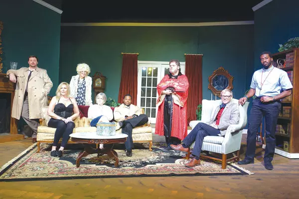 Photos by Laura Kay ProsserMystery writers, from left, Chandler Marlow (Paul Brown), Charity Haze (Lorna Boyd), Miss Maple (Sandi Wheatley), Rita (Denise Young), Rick Carlyle (Christopher Thompson), Louie Fan (John Rose), Peter Flimsey (Ken Priest), and Father White (Quincy Washington) gather in the sitting room, unaware of the mystery yet to come. “The Butler Did It” premieres Feb. 19 -22.