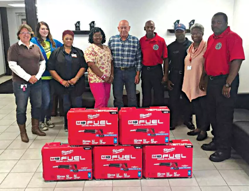Milwaukee Electric Tool Corp. has donated five new reciprocating saws to the Greenwood Fire Department. At the presentation are, from left, Milwaukee Tool employees Crystle Black, Amber Montgomery, Kathy Young, Katie Harris, Jack Bilotta, Greenwood Fire Department Captain Marvin Turner, Firefighter First Class Marquivious Bankhead, Milwaukee Tool employee Sherry Peyton and Fire Department Captain Charles Cooley.