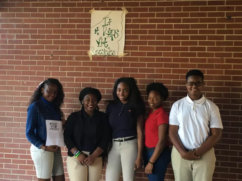 Amanda Elzy High School Student Government members stand in front of one of the many posters created to promote recycling efforts in their school. From left are Makiyah Wallace, 11th-grader and chairman of the decorating committee; Kyla Cole, 12th-grader and president of the Student Government Association; Makiah Kelly, 12th-grader and senior senator; Daniekeyanna Ghoston, ninth-grader and environmental committee chairman; and Alijah Jones, ninth-grader and environmental committee co-chairman.