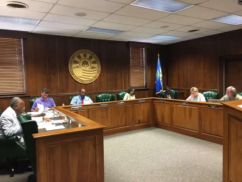 Greenwood’s sales tax allocation is up 6 percent over last year, according to City Council President Ronnie Stevenson. Pictured are, from left, Councilman David Jordan (Ward 6), obscured but next to Jordan, Councilman Andrew Powell (Ward 5), city attorney Don Brock, Stevenson (Ward 3), council clerk Cinderella Morris, Councilman Charles McCoy (Ward 4), Councilwoman Lisa Cookston (Ward 2) and Councilman Johnny Jennings (Ward 1).