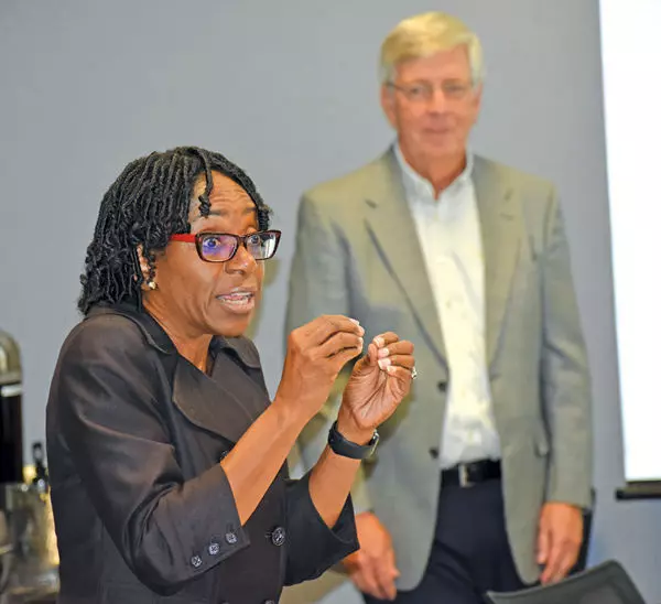 Kathy Boswell from the Healthcare Experience Foundation makes a point during Tuesday’s meeting of the Greenwood Leflore Hospital Board. Behind Boswell is Al Stubblefield, also from the Florida-based consulting firm that has been hired to help the hospital improve patient satisfaction.