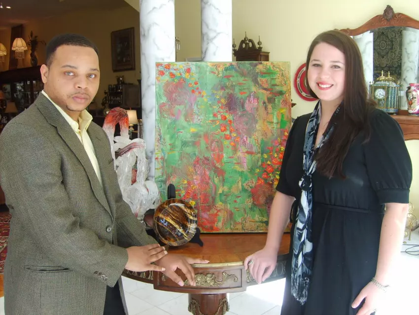 Local artists Darryl Collins, left, and Ann Homolik Bartlett show off some of their pieces at Russell's Antiques. Collins, who makes glass art, and Bartlett, who works with oil paints, will be displaying their artwork at the downtown shop Thursday evening during Art Alfresco. More than 40 other artists also will participate in the annual event. (Photo by Rachel Hodge)